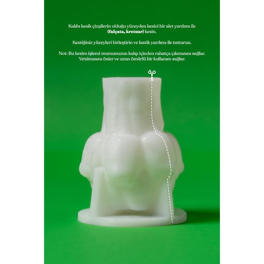 Söz konusu kalıbı keserek kullanmanız önerilmektedir. Ağız bölümü gövde bölümüne göre daha dardır. Kalıbı görsel üzerinde kesik çizgiler eklenmiş yüzeyinden kesici bir alet yardımı ile falçata, kretuar vs. kesin. Kestiğiniz yüzeyleri öpüştürün ve lastik yardımı ile tutturun. Bu kesim işlemi mumunuzun kalıp içinden rahatça çıkmasını sağlar. Yırtılmasını önler ve uzun ömürlü bir kullanım sağlar.